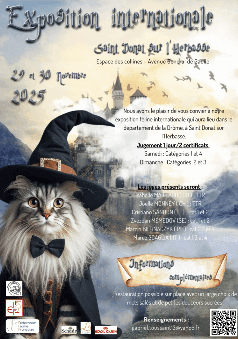 Nous serons à l’exposition féline de Saint Donat sur l’Herbasse Retrouvez-nous le dimanche 30 novembre à Saint Donat sur Herbasse (26260, France). Plus d’infos et détails pratiques sur le site